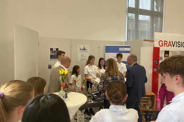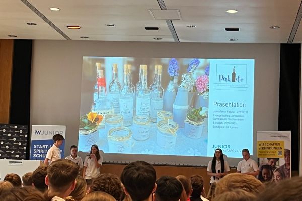 Gemeinsam mit den Lehrkräften Eva Binder und Till Kernen reiste das zehnköpfige Team um die Vorstandsvorsitzende Louisa Glemser also nach Stuttgart, um dort den eigenen Stand mit Produkten und Plakaten zu schmücken. Nach der Begrüßung, unter anderem von hohen Vertretern des Ministeriums der Wirtschaft sowie des Kultus, Jugend und Sports, ging es dann endlich los. Zunächst stellten alle 10 JUNIOR-Unternehmen ihr Team und ihre Produkte und Visionen in einem 5-minütigen Pitch vor, den sie vor den versammelten 200 Teilnehmer:innen und Zuschauer:innen hielten. Dabei zeigte "PAKIDO", wie sie auf ihre Ideen zum Upcycling von Glasflaschen kamen, analysierten ihre Finanzen und Marketing und gaben einen Ausblick, welche Ideen sie noch für die Zukunft haben.