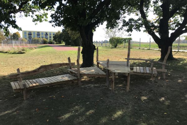 Bei unserem Barcamp im letzten Schuljahr kam aus der Schülerschaft der Wunsch nach mehr Sitzgelegenheiten im Freien zum Arbeiten und auch zum Chillen. Gleichzeitig gab es am Ende des letzten Schuljahres eine Studienfahrt , bei der die Schüler*innen mit Unterstützung durch KuKuk Kultur e.V. einen Spielplatz an einer Schule im Kosovo gebaut haben.