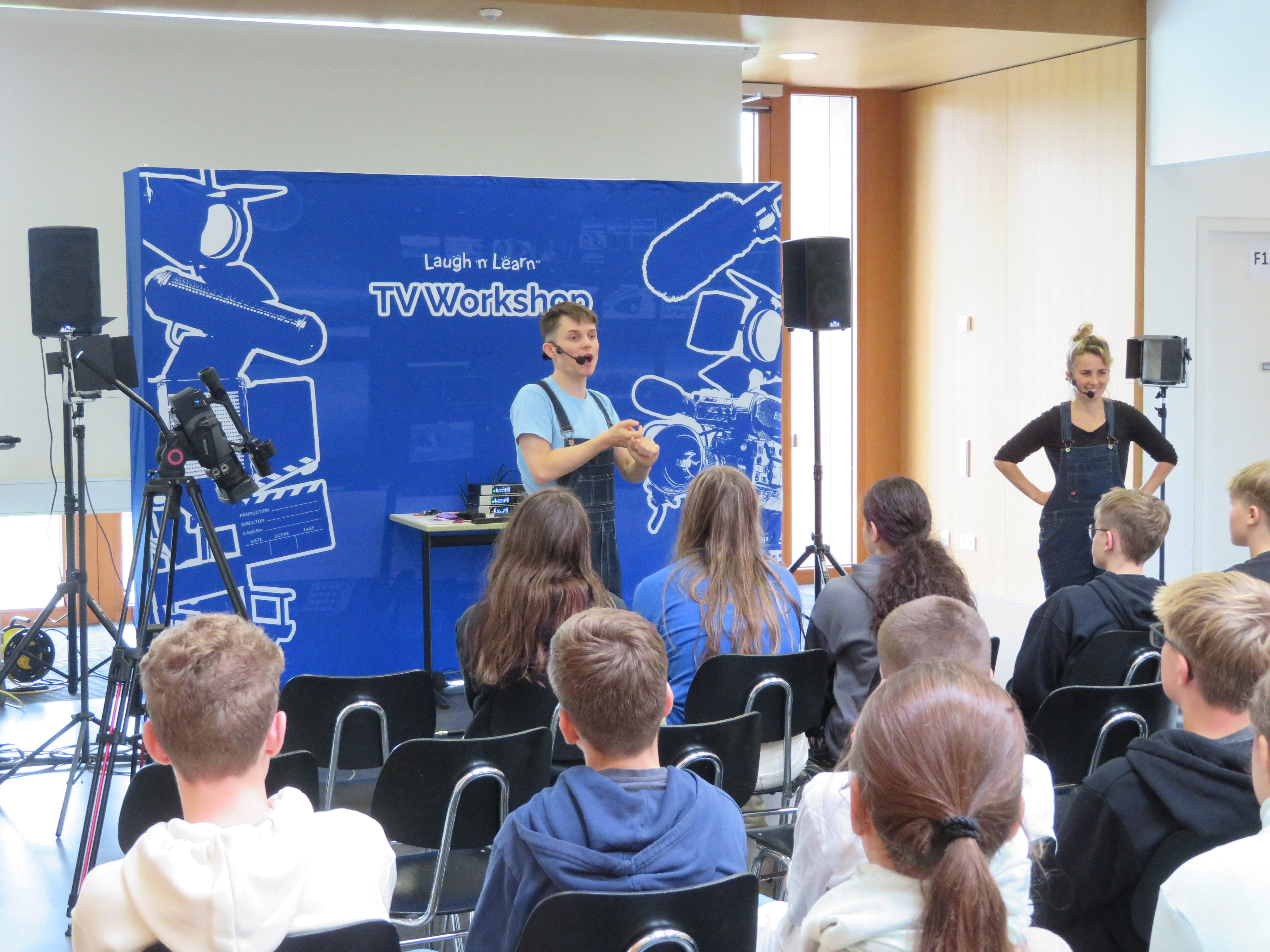 Die Teilnehmenden lernten bei der einstündigen Veranstaltung, die sie im Stufenverband besuchten, die verschiedenen Rollen und Abläufe bei einer TV-Produktion kennen. Ob als Schauspieler:in, Kameramann/-frau, Tontechniker:in, Produzent:in oder Regisseur:in – die Schülerinnen und Schüler schlüpften selbst in die Rollen, erarbeiteten eine kurze Szene und setzten diese anschließend gemeinsam um.