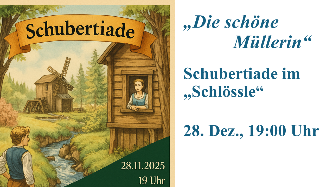 Der Musik-LK K2 des Evang. Lichtenstern-Gymnasiums lädt zur Schubertiade ein. Alles rankt sich dabei um den Liederzykluks "Die schöne Müllerin" von Franz Schubert aus dem Jahr 1823. Die textliche Vorlage stammt von Wilhelm Müller und erschien zwei Jahre zuvor 1821.