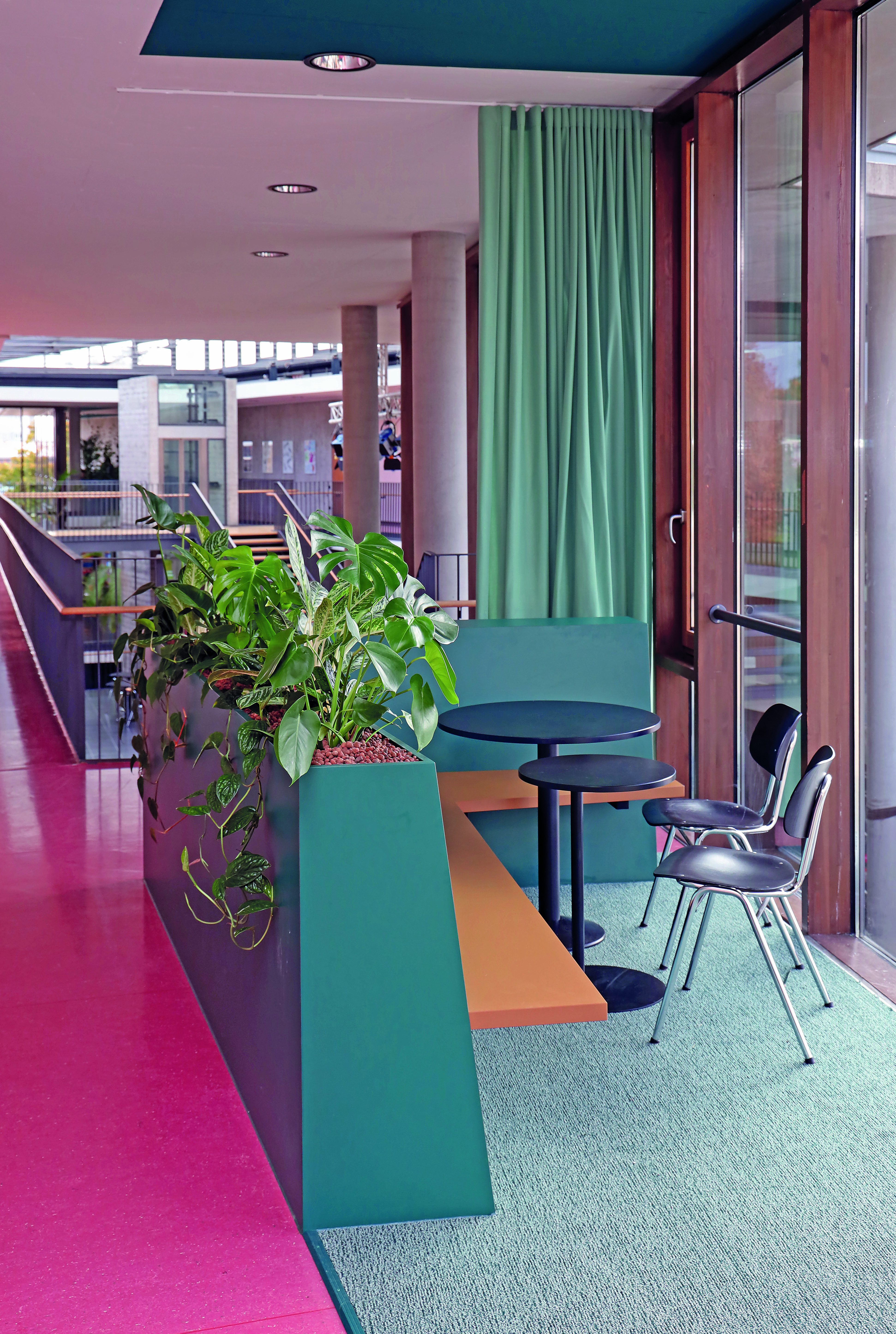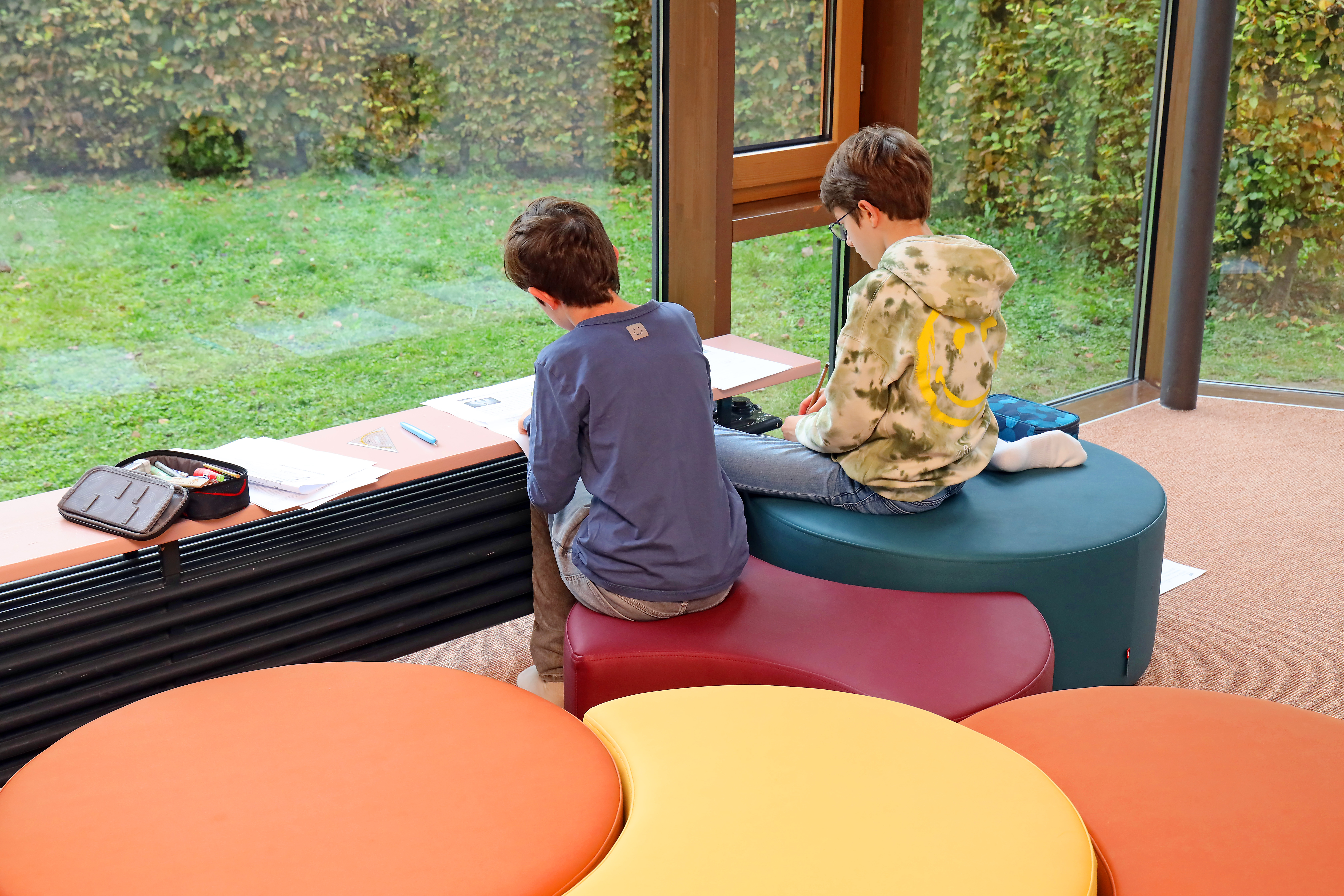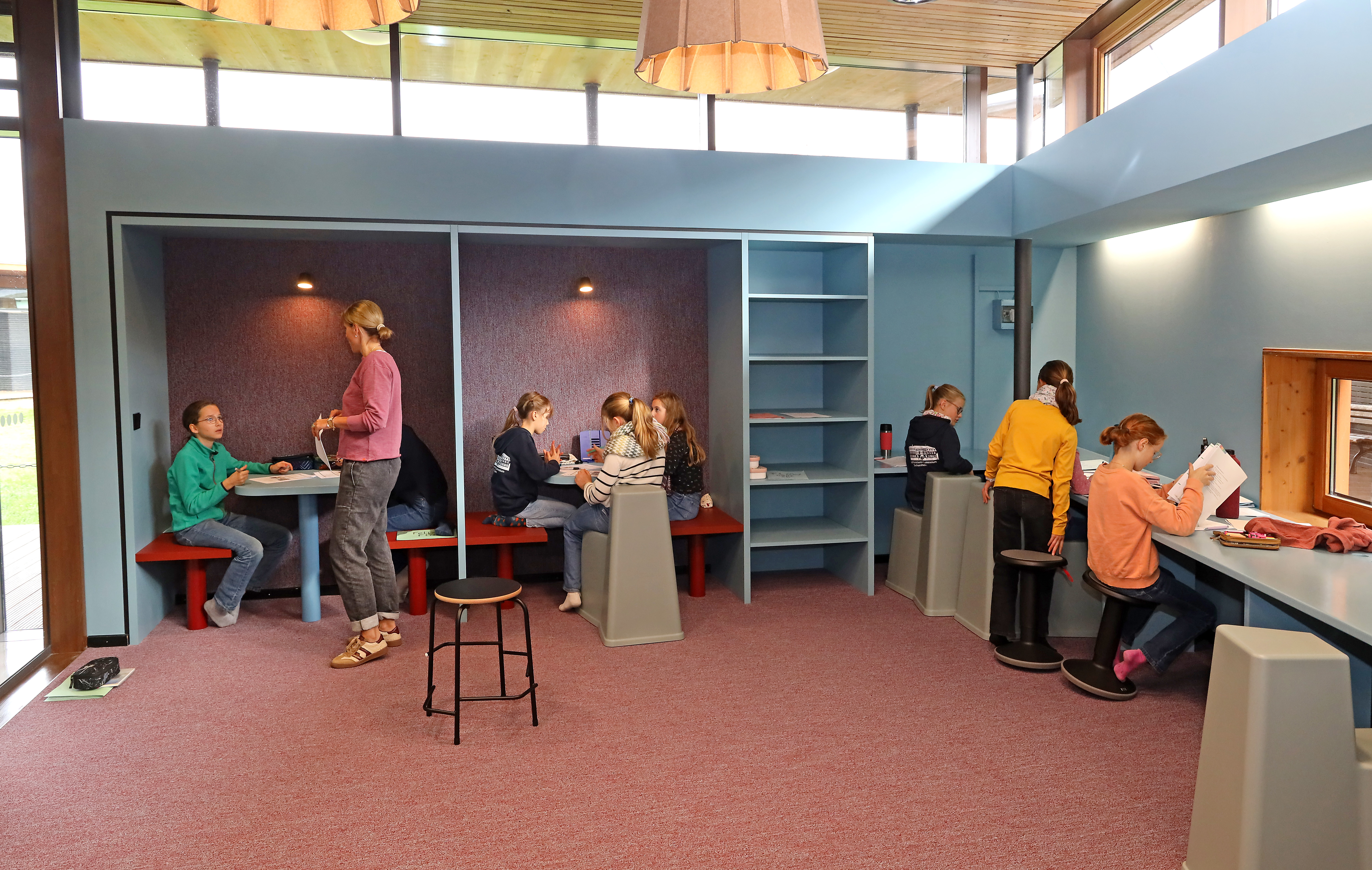 Sitznischen, kleine Tische, Beleuchtungselemente mit ansprechenden und schalldämmenden Lampen, Vorhänge und ergänzendes Mobiliar zeichnen unsere Selbstlernbereiche aus. Ob in Einzel-, Partner- oder Gruppenarbeit gelernt wird – alles ist möglich.