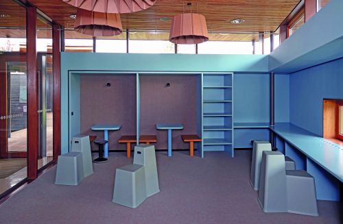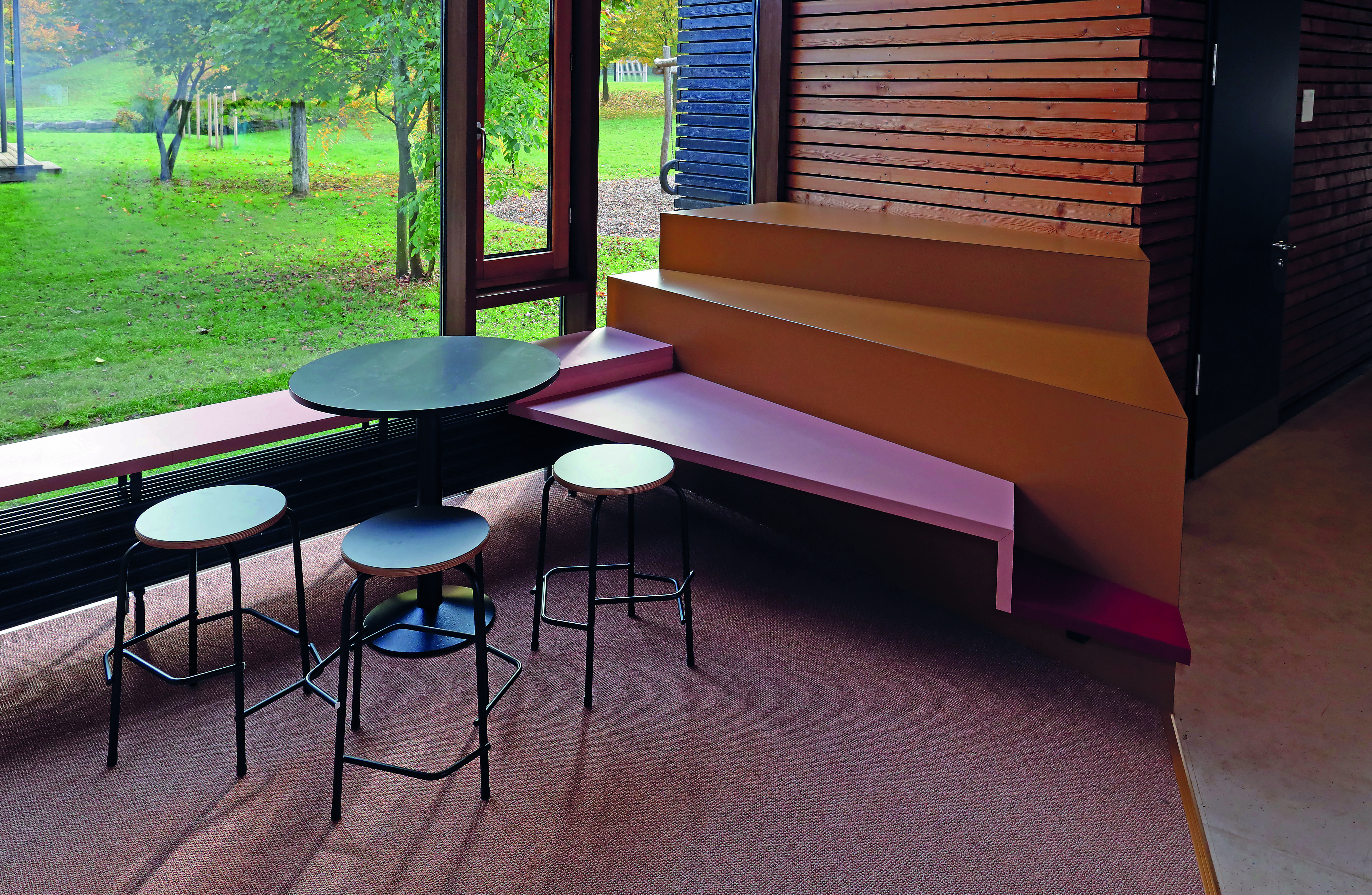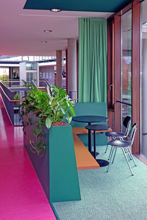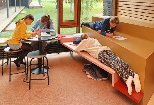 Rund um das Lernen braucht es Raum. Dieser sollte zum Lernen einladen. Die Lernumgebung sollte Lust auf Lernen machen. Nicht ohne Grund nannte der Pädagoge Malaguzzi (1920-1994) den Raum als „dritten Pädagogen". Gerade als Ganztagesschule fühlen wir uns dieser Aussage verpflichtet, für unsere Schülerinnen und Schüler Lernumgebungen zu schaffen, in denen sie sich wohlfühlen können und ihrer Kreativität freien Lauf lassen. In unseren Pavillons haben wir Lern- und Aufenthaltsnischen geschaffen, in denen Lernen und Entspannen zusammenfinden. Gerade in Phasen eigenverantwortlichen Lernens können sich Schülerinnen und Schüler ihr Lernsetting wählen oder auch gestalten. Auf Hockern, in den Sitzregalen, auf Podesten oder coolen Barhockern – was die Kreativen in diesem Sommer bei uns geschaffen haben, ist einmalig. In vielen intensiven Sitzungen kamen Schülerinnen und Schüler, Lehrer, Eltern mit den verantwortlichen Mitarbeitern unserer Schulträgerin und der Innenarchitektin zusammen und ließen ein spannendes und einmaliges Möblierungskonzept entstehen.